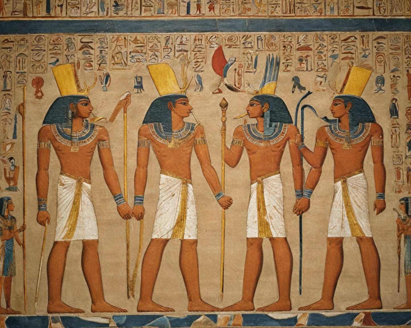 Entre as divindades mais conhecidas estão Rá, o deus Sol, criador do universo e fonte de toda luz; Ísis, a deusa-mãe da magia e da maternidade; Osíris, governante do além-vida e símbolo de renascimento; Set, o deus associado ao caos e à desordem; e Hórus, o falcão divino, conhecido por sua justiça e vitória. Estas figuras mitológicas, com suas interações dinâmicas e muitas vezes conflitantes, formam o alicerce de muitos mitos que transportam lições de moral, ética e poder.